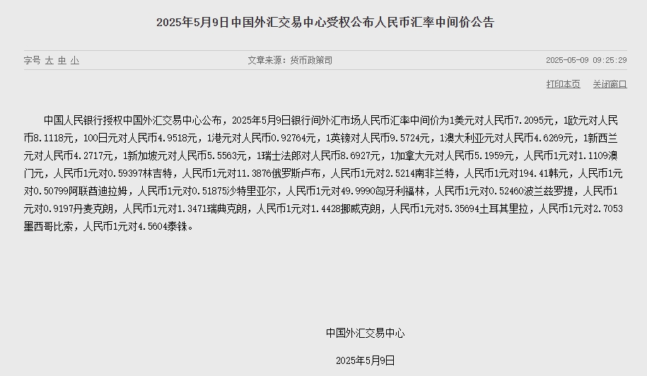 中新网5月9日电 据央行网站消息,中国人民银行授权中国外汇交易中心公布,2025年5月9日银行间外汇市场人民币汇率中间价为1美元对人民币7.2095元,1欧元对人民币8.1118元,100日元对人民币4.9518元,1港元对人民币0.92764元,1英镑对人民币9.5724元,1澳大利亚元对人民币4.6269元,1新西兰元对人民币4.2717元,1新加坡元对人民币5.5563元,1瑞士法郎对人民币8.6927元,1加拿大元对人民币5.1959元,人民币1元对1.1109澳门元,人民币1元对0.59397林吉特,人民币1元对11.3876俄罗斯卢布,人民币1元对2.5214南非兰特,人民币1元对194.41韩元,人民币1元对0.50799阿联酋迪拉姆,人民币1元对0.51875沙特里亚尔,人民币1元对49.9990匈牙利福林,人民币1元对0.52460波兰兹罗提,人民币1元对0.9197丹麦克朗,人民币1元对1.3471瑞典克朗,人民币1元对1.4428挪威克朗,人民币1元对5.35694土耳其里拉,人民币1元对2.7053墨西哥比索,人民币1元对4.5604泰铢。