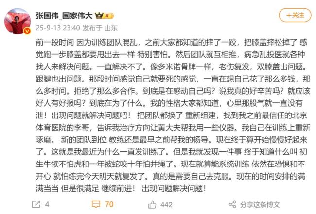 张国伟一度陷入自我怀疑,质疑自己的努力是否值得。但他没有放弃,决定重新组建团队,并亲自参与训练计划的调整。新的团队由之前的教练杨导带领,情况终于开始好转。他解释说,最近频繁发布训练视频正是出于这个原因。尽管目前情况有所改善,但张国伟仍担心旧伤复发,坚持“出现问题就解决问题”的态度。