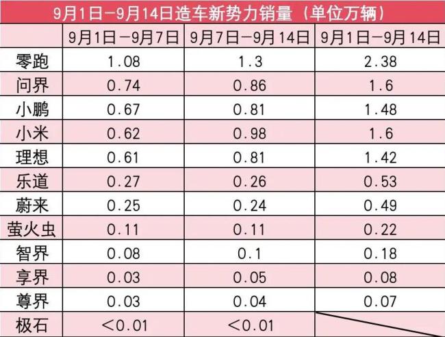 进入9月第二周(9月8日—9月14日),多家新势力销量都稳步回升。其中,零跑以超万辆的成绩稳居第一;小米反超问界和小鹏,以接近万辆的成绩排在第二;紧随其后的是问界、小鹏、理想,三家上周销量均在0.8万辆以上;乐道和蔚来销量则双双出现下滑。