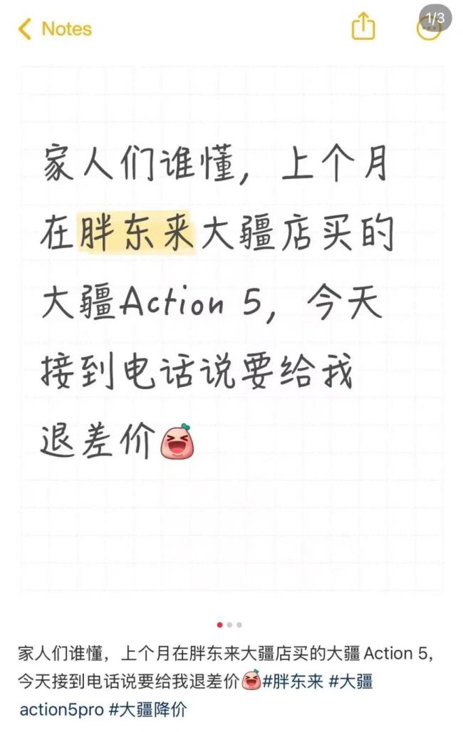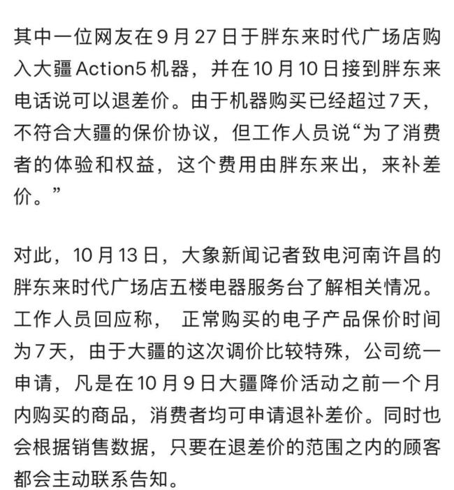 近日,多位网友在社交平台分享经历,称收到胖东来工作人员的电话通知,告知他们之前购买的大疆系列产品已降价,可前往门店专柜退还差价。
