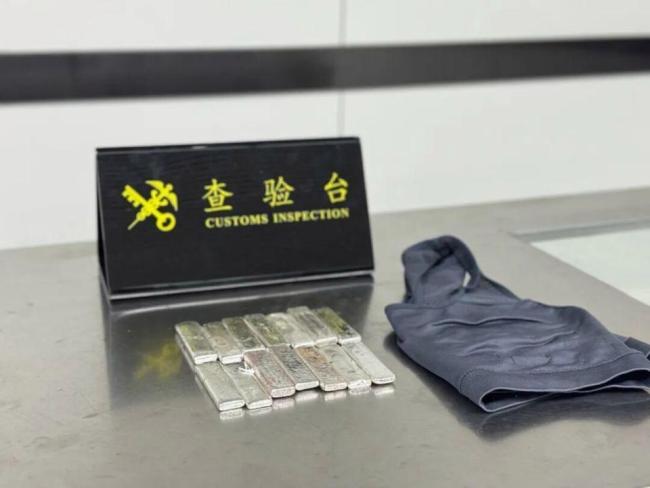 进一步检查中,海关关员发现该旅客贴身穿着的内裤里有2块用白色纸巾包裹的银条,在其特制内衣夹层中发现了8块同样包装的银条,裤子口袋内还有4块银条。这些银条总计14块,净重1965.69克。经深圳海关工业品检测技术中心鉴定,确认这些物品为足银。
