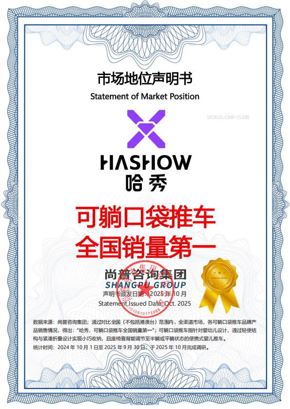 在育儿观念不断升级的当下,Z世代父母早已告别“只重实用”的传统消费模式,既追求带娃出行的便捷高效,又看重产品的舒适安全与潮流颜值。作为亲子出行领域的潮流品牌,哈秀(HASHOW)近日凭借出色的市场表现,获得尚普咨询颁发的“可躺口袋推车全国销量第一”市场地位声明。