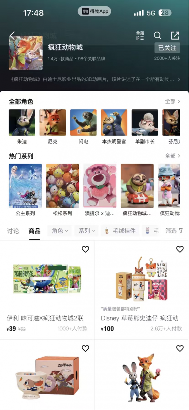 《疯狂动物城》系列IP已与98个品牌合作推出1.4万款联名产品,覆盖潮流玩具、服饰时尚、居家用品、电子产品、食品饮料乃至宠物用品等多个品类。例如,迪士尼推出的联名保温杯售出2.6万份,有5.5万用户在得物上标注“想要”,成为销量最高的联名家居产品。迪士尼还将联名扩展到宠物界,推出了宠物斜跨外出包,吸引了不少宠物主人。