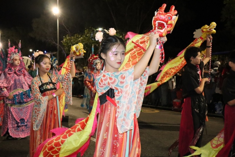 本次华人方阵融合传统文化与现代科技,8米高的巨型醒狮花车非常吸睛,花车上搭载智能机器人,狮头灵动、气势十足,伴随《男儿当自强》的激昂乐曲,中华焰火龙腾空飞舞、流光溢彩。吉米虎花车上,川剧变脸表演引得现场观众阵阵喝彩。
