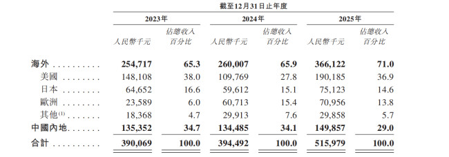 XREAL已稳居赛道龙头,2022年至2025年连续4年稳居全球AR眼镜市场之首,2025年市场份额27%。公司重点布局海外市场,2023年至2025年,海外收入分别约2.55亿元、2.60亿元和3.66亿元,分别占总收入65.3%、65.9%和71.0%。其中,美国市场收入占比过半。