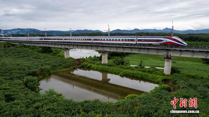 4月11日,中老铁路国际旅客列车通过云南省西双版纳州橄榄坝特大桥。殷学合 摄
