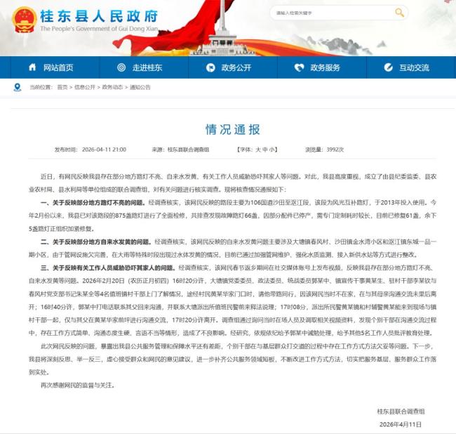 关于工作人员威胁恐吓其家人的问题,经调查核实,该网民春节返乡期间在社交媒体账号上发布视频,反映该县存在部分地方路灯不亮、自来水发黄等问题。2026年2月20日(农历正月初四)16时20分许,大塘镇党委委员郭某中、镇宣传干事黄某生、驻村干部李某钦与春风村党支部书记朱某全等4名值班镇村干部上门了解情况,途经村民黄某华家门口时,请他带路同行。因该网民当时不在家,在与其母亲沟通未果后离开。随后,郭某中打电话联系其父回来沟通,并联系大塘派出所值班民警前来释法说理。17时08分,派出所民警黄某镜和村辅警黄某能来到现场与镇村干部一起,仅与其父在黄某华家前坪进行沟通交流,17时20分许离开。调查组通过询问当时在场人员及调取相关视频资料,发现个别干部在沟通过程中存在工作方式简单、沟通态度生硬、言语不当等情形,造成了不良影响。经研究,依规依纪给予郭某中诫勉处理,其他5名工作人员受到批评教育。