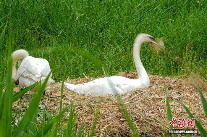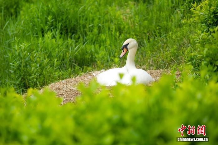 4月16日,河南郑州,随着气温回升,当地疣鼻天鹅进入孵化期。图为郑州西运河区域,疣鼻天鹅在巢中孵蛋。中新社记者 范晓恒 摄