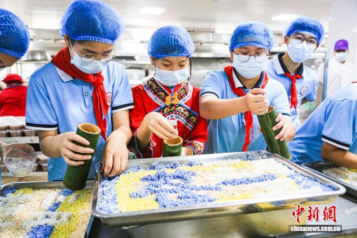 中新网梧州4月16日电(张广权 魏铭均 陈文思)4月15日,广西梧州市苍梧第一初级中学食堂里,五色糯米饭在学生们指尖流转,逐渐拼出“团结”“传承”的字样。这是“三月三”前夕,该校民族美食文化主题活动的一幕。百余名学生在制作传统美食的过程中,体验从指尖到舌尖的文化传承。