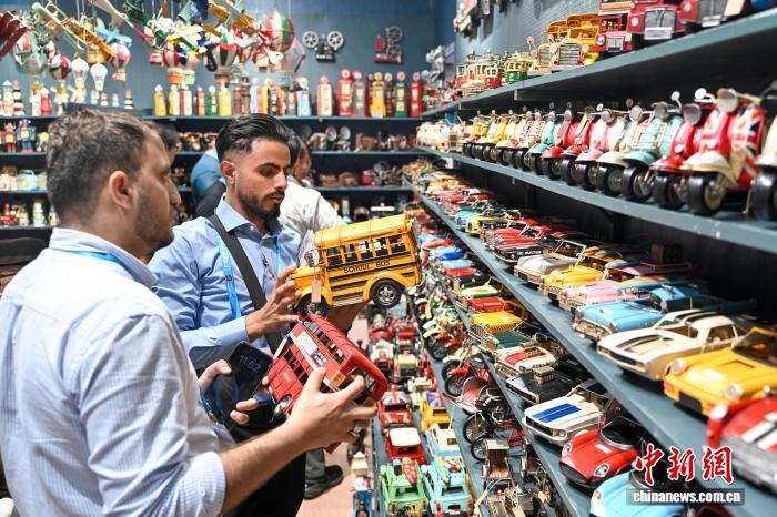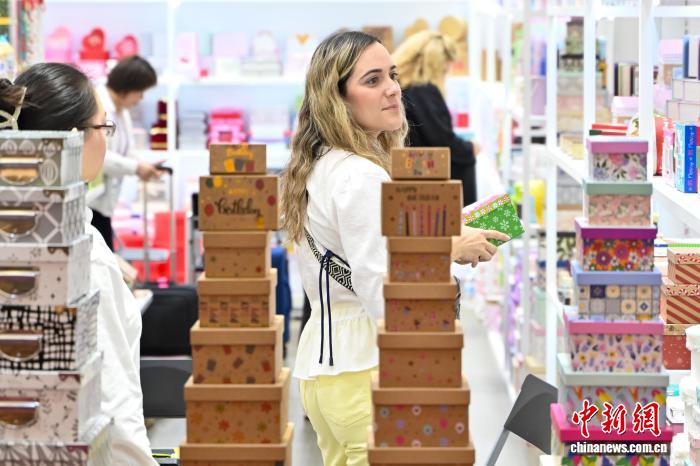 图为境外采购商在礼品及赠品展区挑选产品。中新社记者 陈骥旻 摄