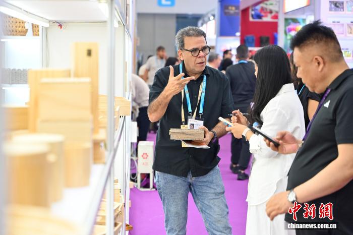 图为境外采购商与参展商洽谈。中新社记者 陈骥旻 摄