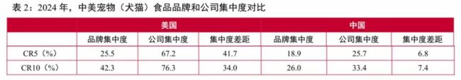 参照美国成熟的宠物行业发展趋势不难发现,宠物食品行业是一个品牌层面竞争充分、公司层面高度集中的成熟市场,2024年美国品牌集中度(CR5约25.5%)远低于公司集中度(CR5约67.2%)。其中玛氏、雀巢等巨头通过庞大的多品牌矩阵,覆盖不同价格带和消费需求。