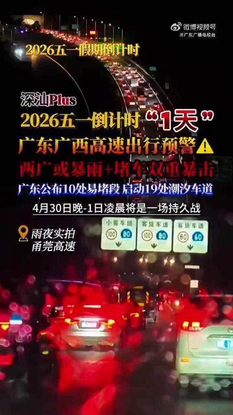 2026年“五一”假期进入倒计时最后一天,广东、广西两省区发布高速公路出行预警。届时,两地或将面临暴雨天气与严重拥堵的双重考验。广东省已公布10处易拥堵路段,并启用19处潮汐车道。预计4月30日晚至5月1日凌晨,出行压力将持续较大,或将成...