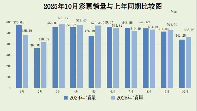 中新网11月24日电 据财政部网站消息,财政部24日在其官网公布2025年10月份全国彩票销售情况。10月份,全国共销售彩票468.93亿元,同比增加26.68亿元,增长6.0%。1-10月累计,全国共销售彩票5230.30亿元,同比增加98.
