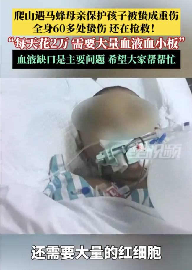 妈妈为保护儿子被马蜂蛰60多针。近日,重庆,彭先生一家去爬山遇马蜂,妻子谭小丽为保护9岁儿子被蛰成重伤陷入昏迷,还在重症监护室抢救。因为病情危重,随时有生命危险,谭小丽需要大量血浆置换治疗,用血需求大。彭先生向广大市民求助,有爱心人士愿意献...