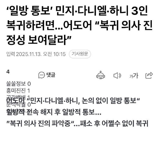 ADOR内部也弥漫着难以立即接受三人回归声明的氛围。有人指出,这种“单方面的回归通报”与去年11月NewJeans单方面通知解约时的情况相似。此外,今后在回归过程中,可能还会出现需要额外协商的条件,情况尚难预料。尤其是,NewJeans全...