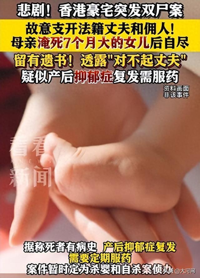 10月13日,香港寿山村豪宅区发生了一起母女双尸案。一名法籍男子报警称其妻子上吊自尽,7个月大的女儿昏迷。警方到达现场后确认母女均已身亡,两人没有其他明显外伤,初步判断为窒息,具体死因需进一步解剖确定