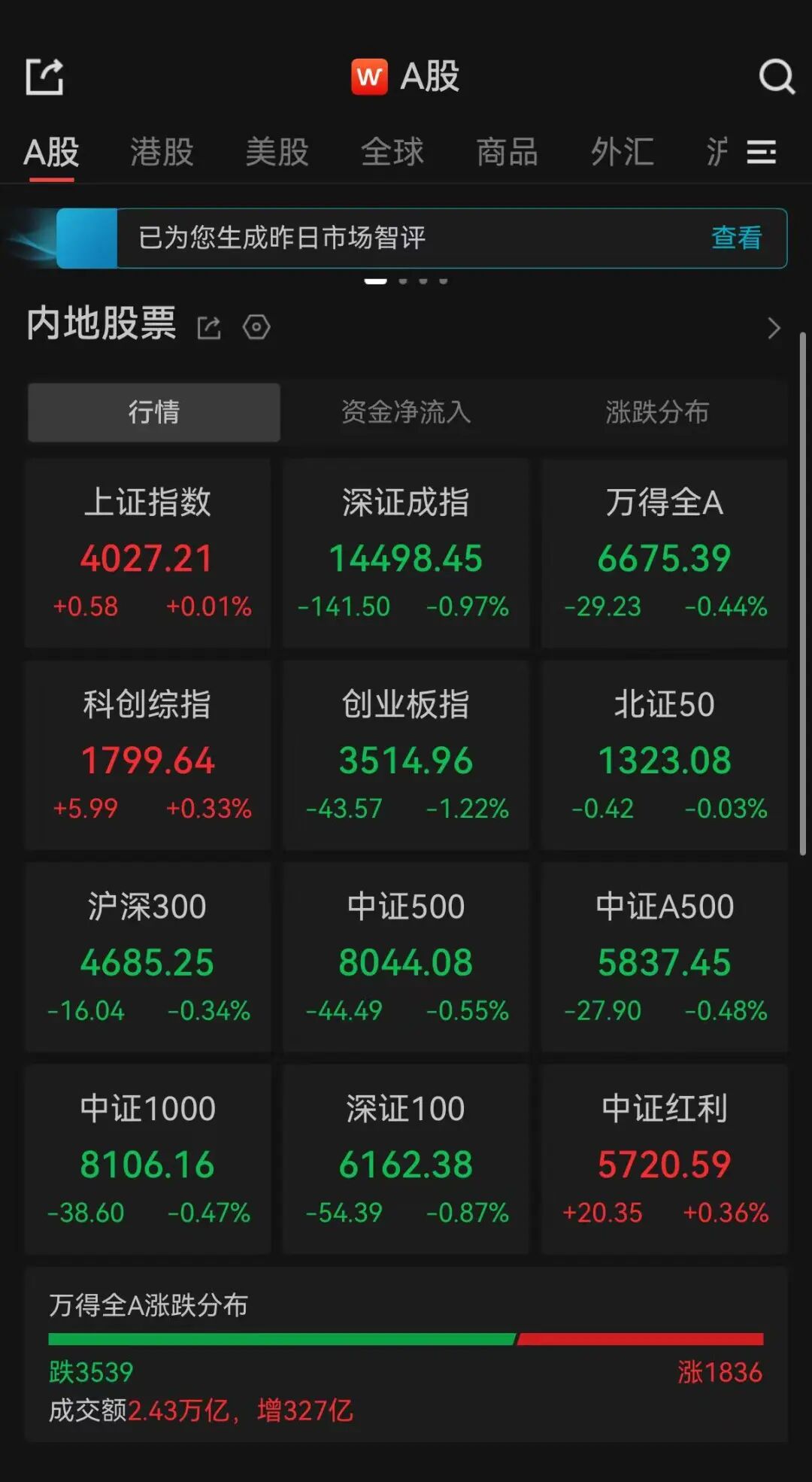 15日,A股三大指数高开低走,深指、创业板指收跌。截至收盘,沪指涨0.01%,深证成指跌0.97%,创业板指跌1.22%。