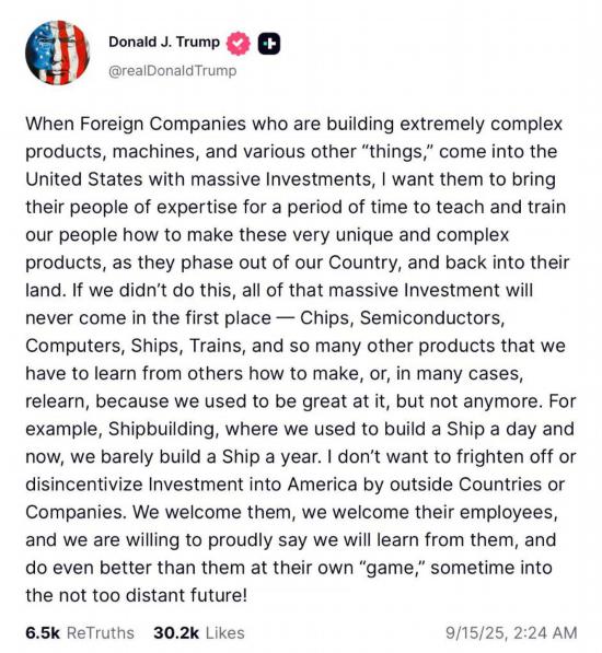 新华社北京9月15日电美国执法人员抓捕300多名在美韩企韩籍员工并引发外交风波约10天后,美国总统特朗普14日发文说,欢迎外国企业带着专业技术人员赴美,并表示不希望“吓退”外国投资者。韩国总统李在明此