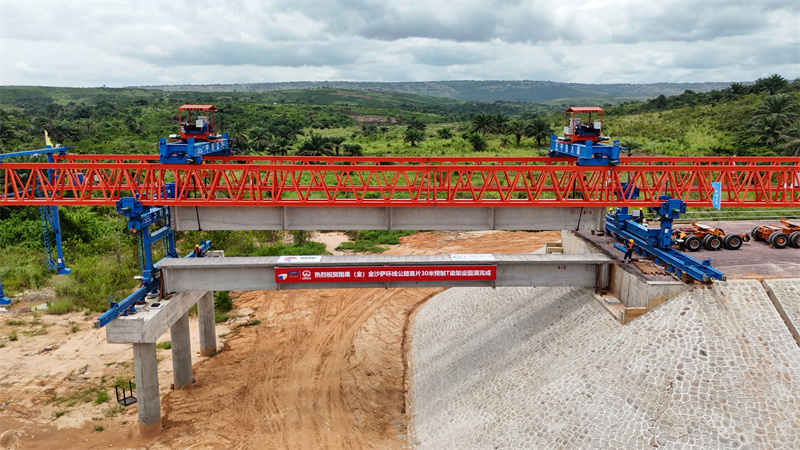 人民网约翰内斯堡4月2日电(记者邹松)3月29日,由中资企业出资并承建的刚果(金)首都金沙萨环线公路项目姆富蒂桥施工现场,一台双导梁自平衡式架桥机将一片长30米、重达82吨的预制T梁精准落位。这是该类