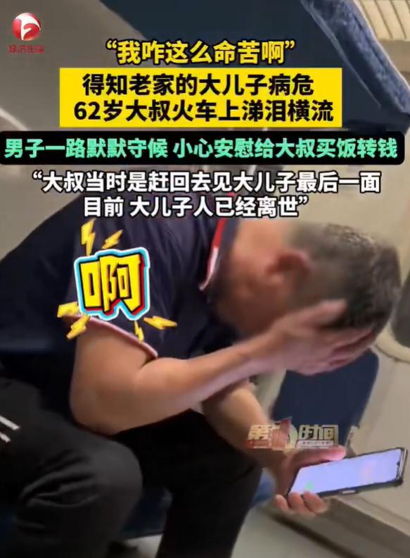 近日,一列从厦门开往重庆的火车上,一位62岁的大叔在通话中声音颤抖,泪流满面。同车的刘先生听出大叔说的是家乡方言,并得知其42岁的大儿子突发脑出血,已在ICU中难以救治